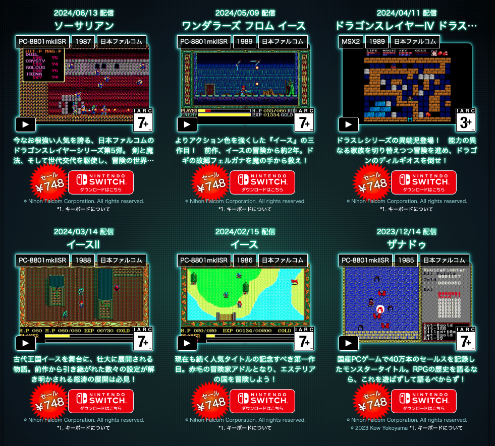 イース1、2、3、ドラゴンスレイヤーシリーズの2(ザナドゥ)、4(IV ドラスレファミリー)、5(ソーサリアン)が5月13日まで15%OFF。残念ながら、全部購入済みなんですよね・・・。