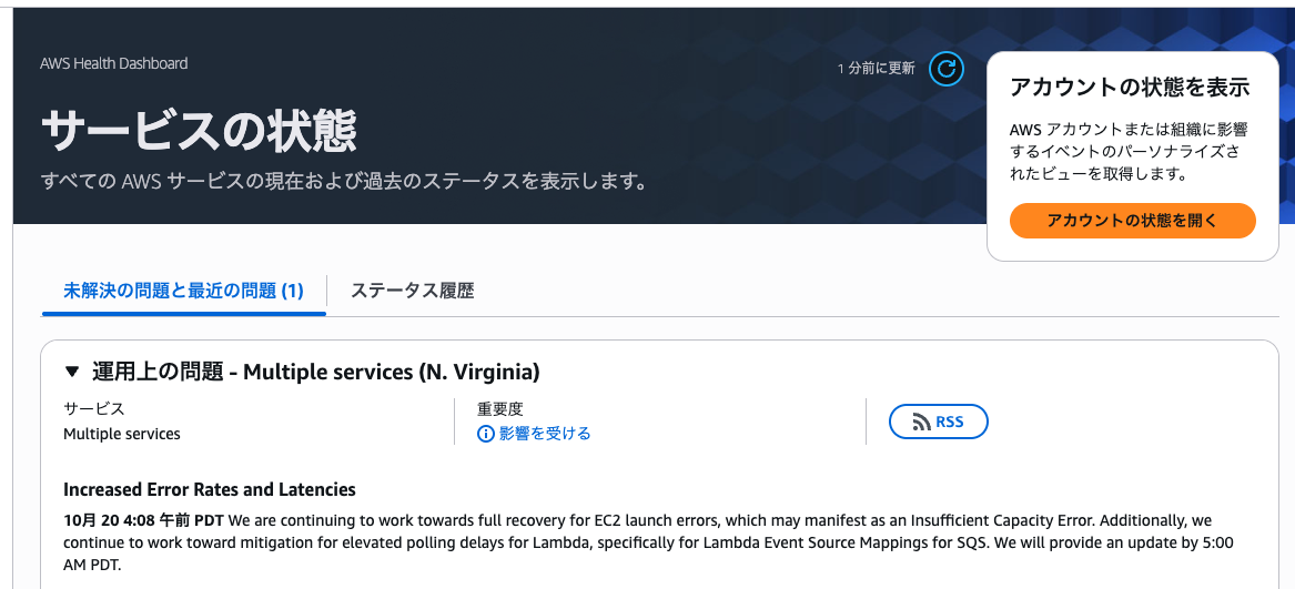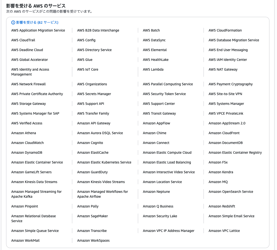 仕事から帰宅してから、FGOを遊ぼうとすると・・・ なんだ、緊急メンテナンス中か・・・ まさか、AWSの障害の影響か?でも、N.Virginiaだから、ua-east-1のみだよな・・・ それにしても、82サービスに影響しているなんて大障害じゃないか・・・ 2025年10月20日 by yoshinobu310 BLOG FGO ゲーム 0
