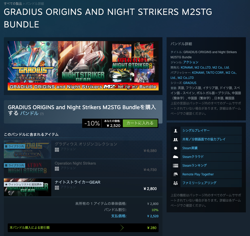 ちなみに、今回、グラディウス オリジンコレクションとOperation Night Strikersを購入済みだったので、Bundle割引10%で2,800円のところ2,520円で買えました。M2製品ってセールとかしないという話らしいので、ありがたい。Switchでは割引ないからねぇ・・・。