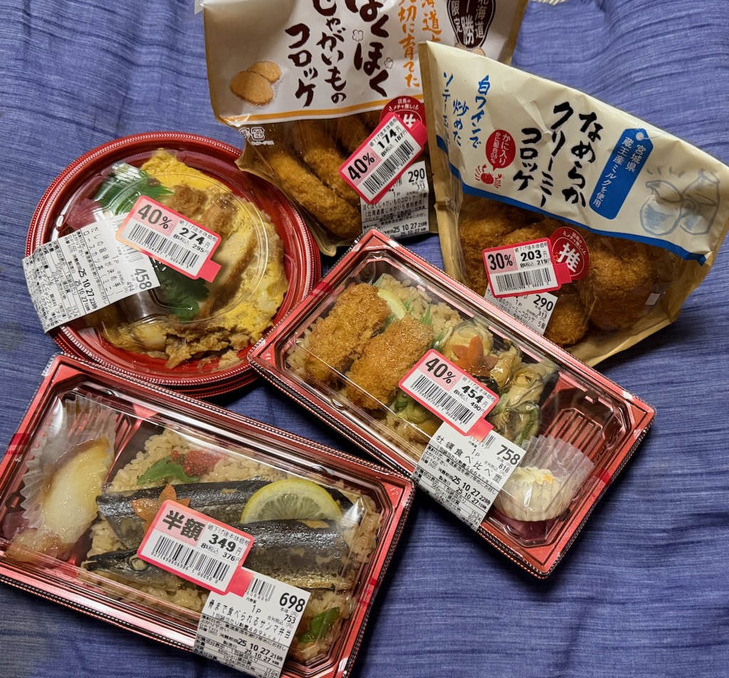 帰りに、一駅隣のマルエツに寄ってみたら、やたらと値引き品があったので買いまくってしまった・・・。というのも、10月末まで有効のマルエツの商品券が2500円分も余っていたから。