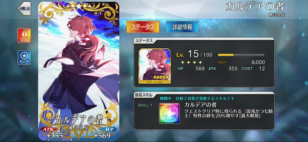 急に追加された概念礼装「カルデアの者」をゲット。[混沌かつ七騎士]特性の絆を20%アップ。これはちょうど久遠寺有珠も最適だなぁ。