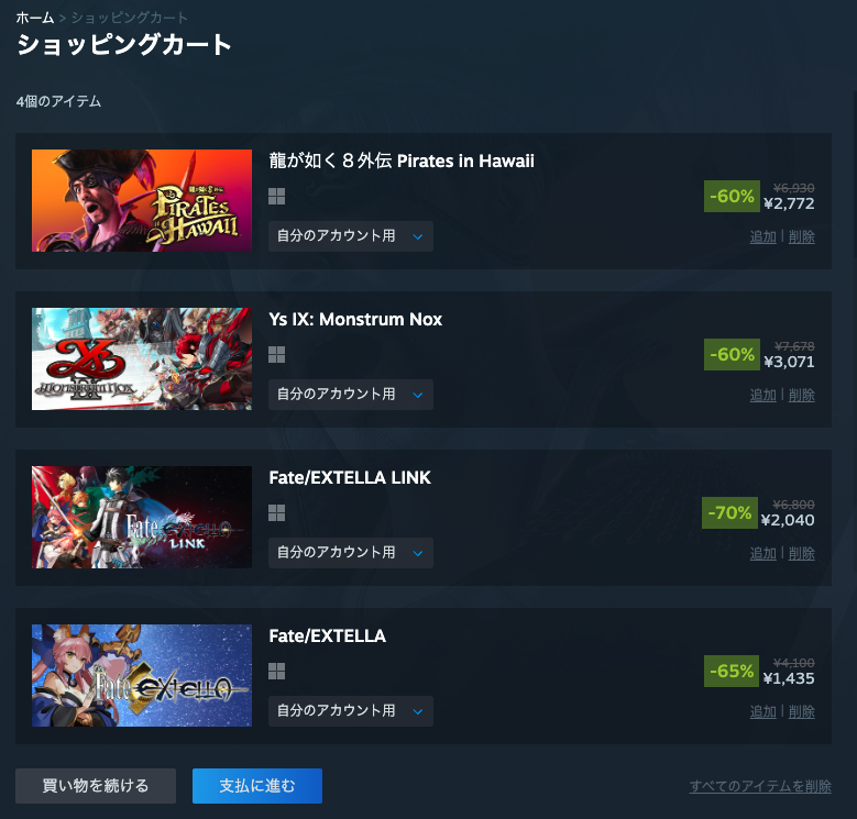 「Ys IX: Monstrum Nox」はまあ、「Ys X -Proud Nordics-」買う前に買っておこうかと。60%OFFの3071円は、今の値下げ傾向からだと数年はここキープしそうだしね。