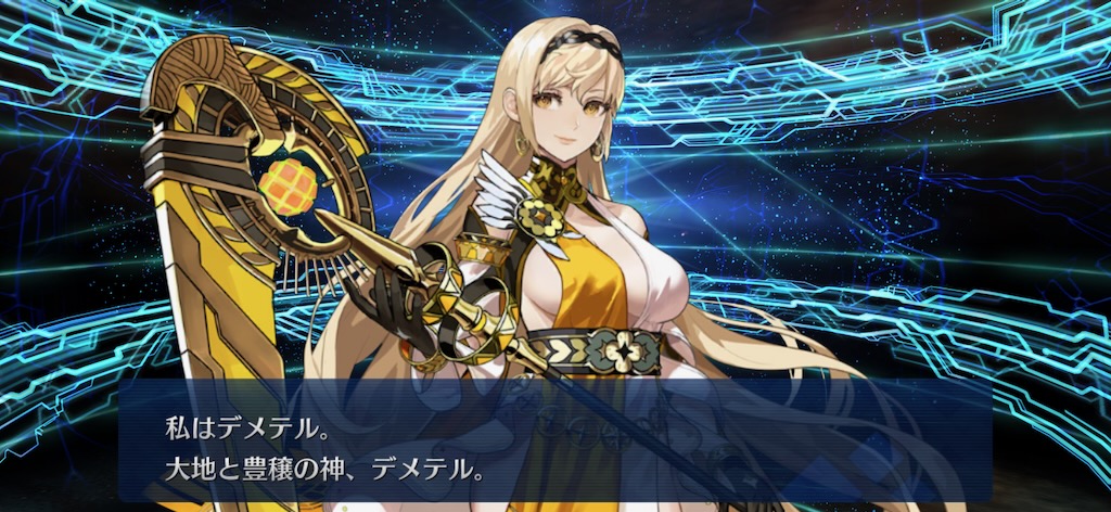 今年のバレンタイン・サーヴァントは大地と豊穣の神、デメテル(ランサー)。第2部5章に出てきたデメテルは異聞帯のデメテルでしたが、こちらは汎人類史の方ということで、セファールとの戦いで真体を無くしています。が、第3再臨が怪しいんだよなぁ・・・、ストーリー進めると出てくるのかな。