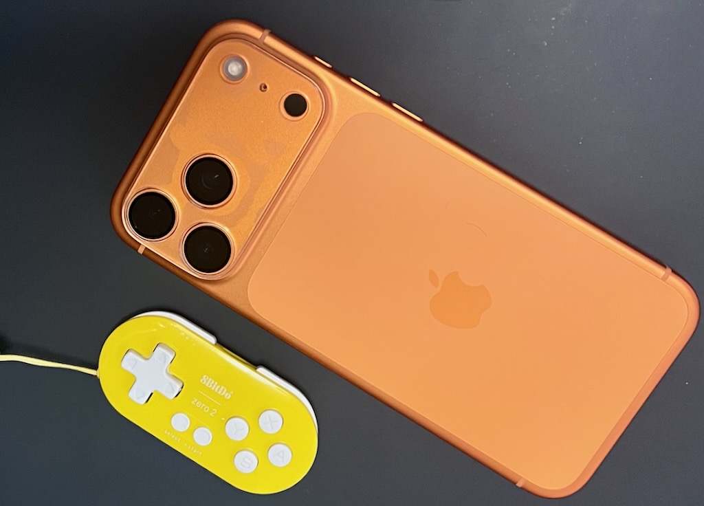 小型のbluetooth接続のジョイパッド「8BitDo Zero2」が届いた。iPhone 17 Pro Maxと比べてみて、かなり小さい。