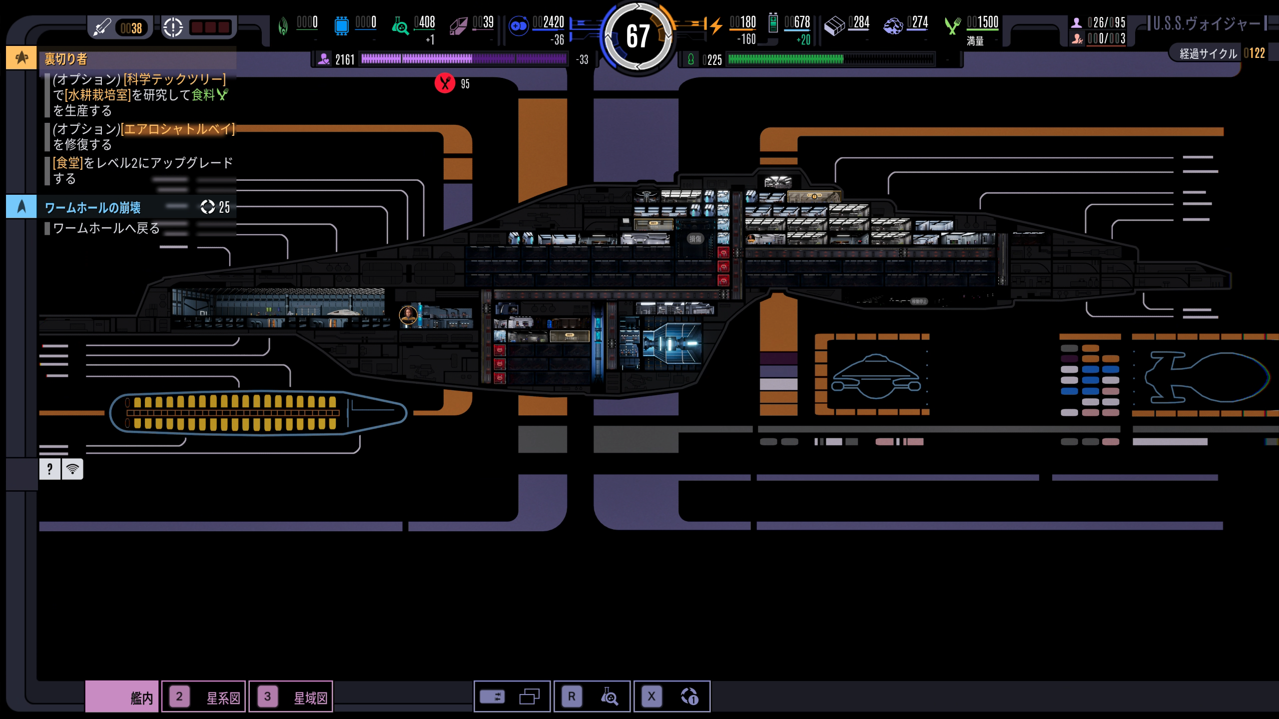 イベントが発生すると、選択肢が出て、どう対応するか決める必要がある。その選択肢で場合によっては乗員が死亡したりもするとシビアな面が・・・。