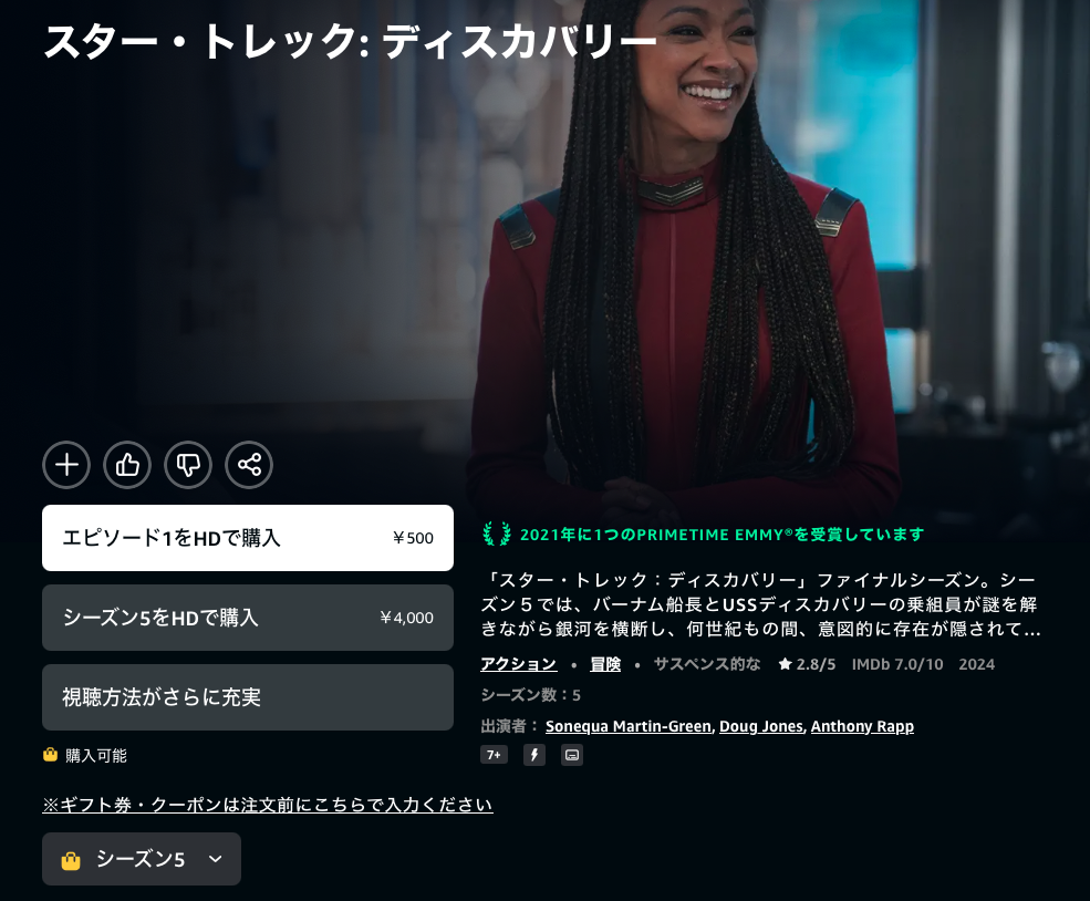 ディスカバリーはシーズン5まで購入可能。ただ、なぜか、シーズン1〜4とシーズン5で分かれている。