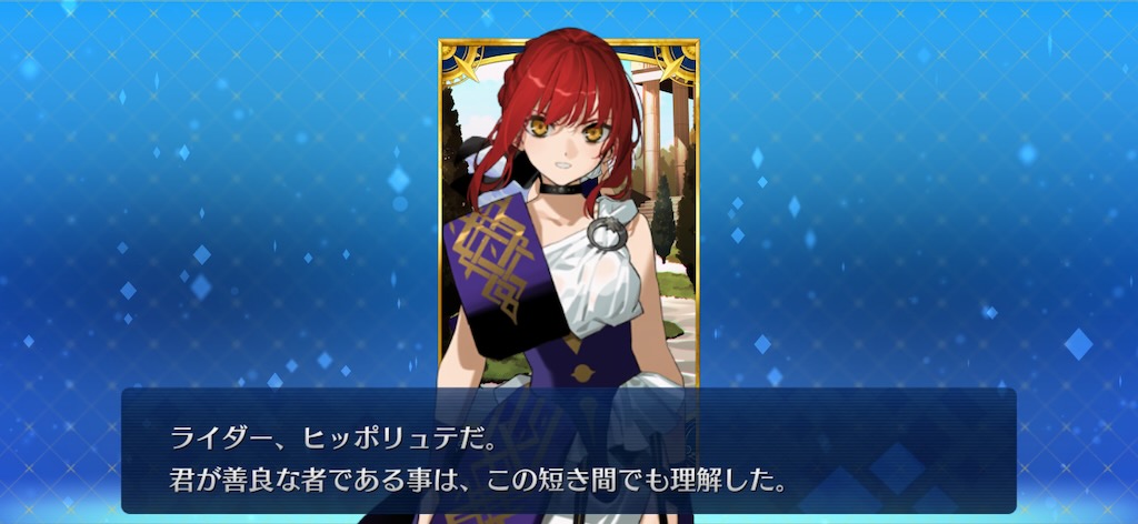 配布は「ヒッポリュテ(ライダー)」、アマゾネスの族長で、ペンテシレイアの姉ですね。詳しくはFakeを(以下略)