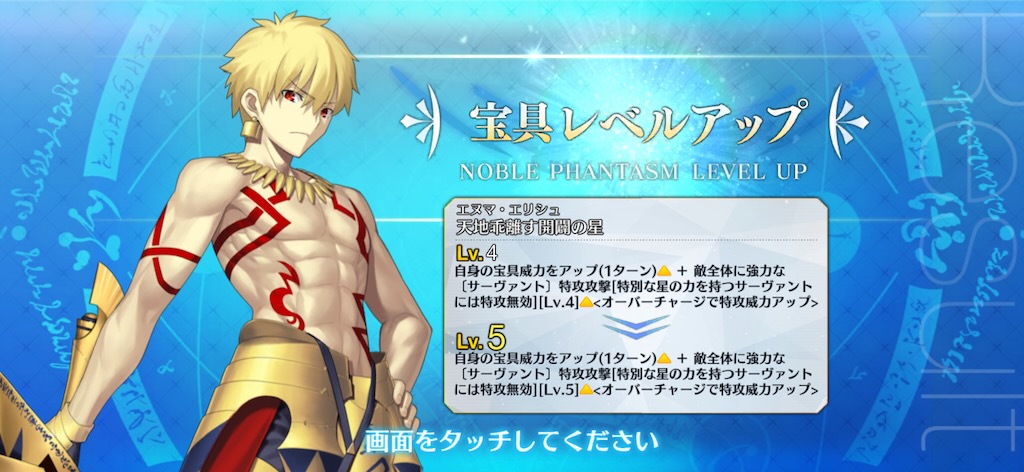 今回は、ギルガメッシュが当たり、宝具レベル5になりました。Lv.6にする予定はないので、代わりに一日一回召喚は高杉に変更しようか。