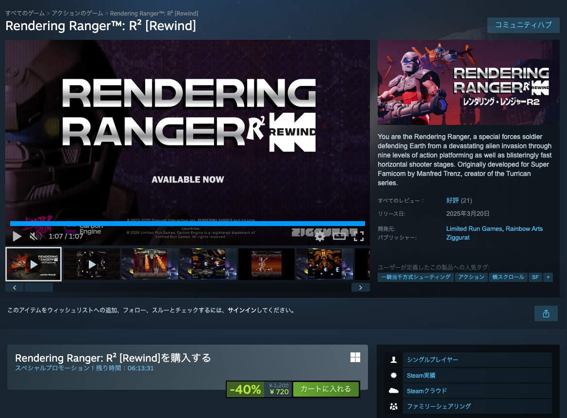 スーパーファミコンの超プレミアレトロゲームとして有名なレンダリング レンジャーがセールしていたので購入。レンダリング レンジャーってスーパーファミコンの末期に発売されてあまり本数が出なかったせいか、4,50万くらいで取引されているらしい。